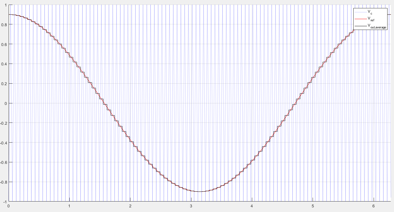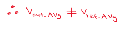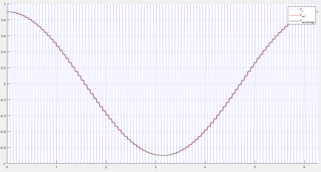 Finally, If we plot the average values of Vout during all Tc intervals, we observe that the averages trace Vref precisely except for some instantaneous differences which correspond to the side band carrier harmonics as we will see in the next lesson.