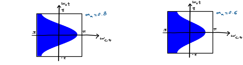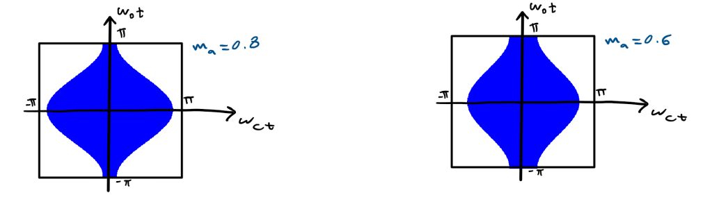 - There are Sideband Harmonics( ‘n’ fundamental multiples around ‘m’ carrier multiples). However, all even sideband harmonics are canceled (if m and n are even or if m and n are odd).