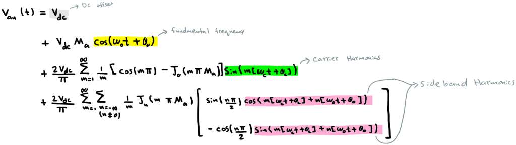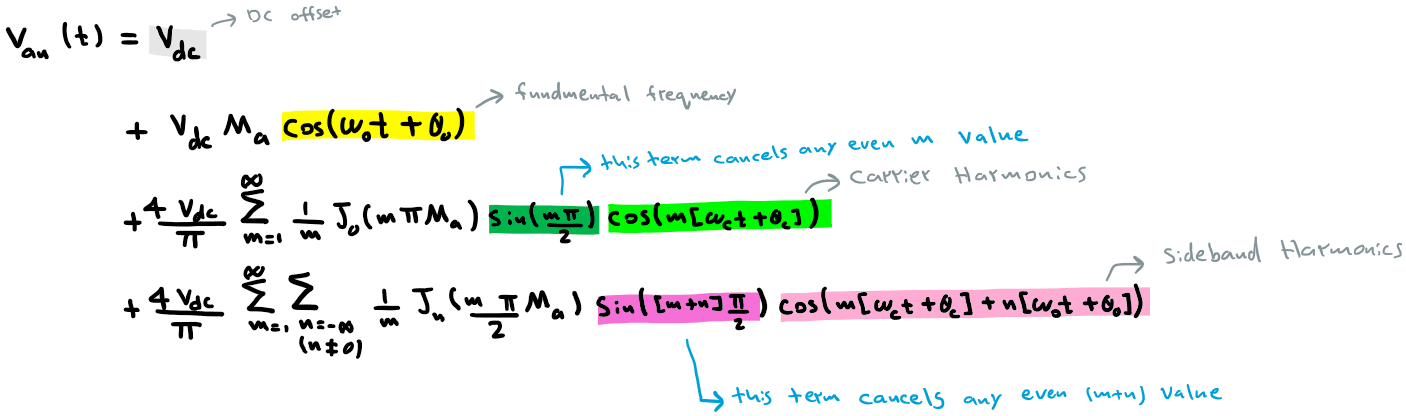 - There are Carrier Harmonics (‘m’ multiples of the carrier frequency). However, all even Carrier Harmonics are Canceled.